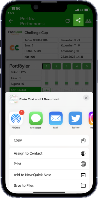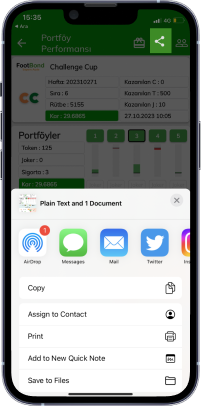 Sağ üstteki paylaş ikonuna tıklayarak portföyünün güncel durumunu sosyal medya hesaplarından paylaş.