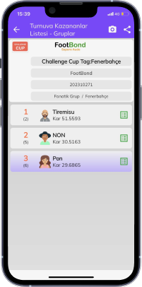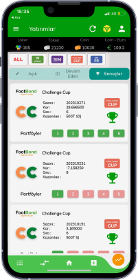 Turnuva maçları sona erdiğinde hesaplamalar yapılır, kazananlar belirlenir ve kazananlar Yatırımlarım -- Sonuçlar altında listelenir.