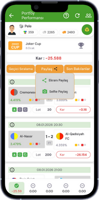 Yatırım yaptığın takım için Joker kullanarak kazancını ikiye katlayabilirsin, oyunun en güçlü kozlarında bir Jokerdir ama unutma takım kaybederse zarar da katlanır.