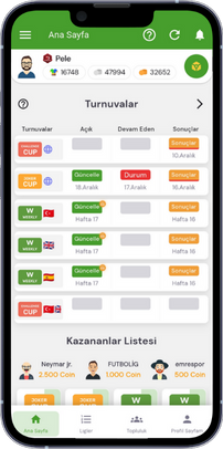 FootBond dünyasında farklı kategorilerde Turnuvalar ve her birinin günlük ya da haftalık olarak oynanan yarışmaları vardır. İstediğin herhangi bir turnuvanın seçtiğin yarışmasına, hiçbir maddi karşılık ödemeden katılabilirsin.