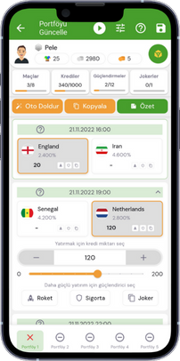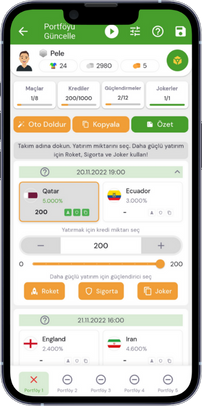 Maçlar oynanırken portföylerin getirisini takip etmek için portföyünü seç. Maç skorlarına gör ve güncel getirini takip et.